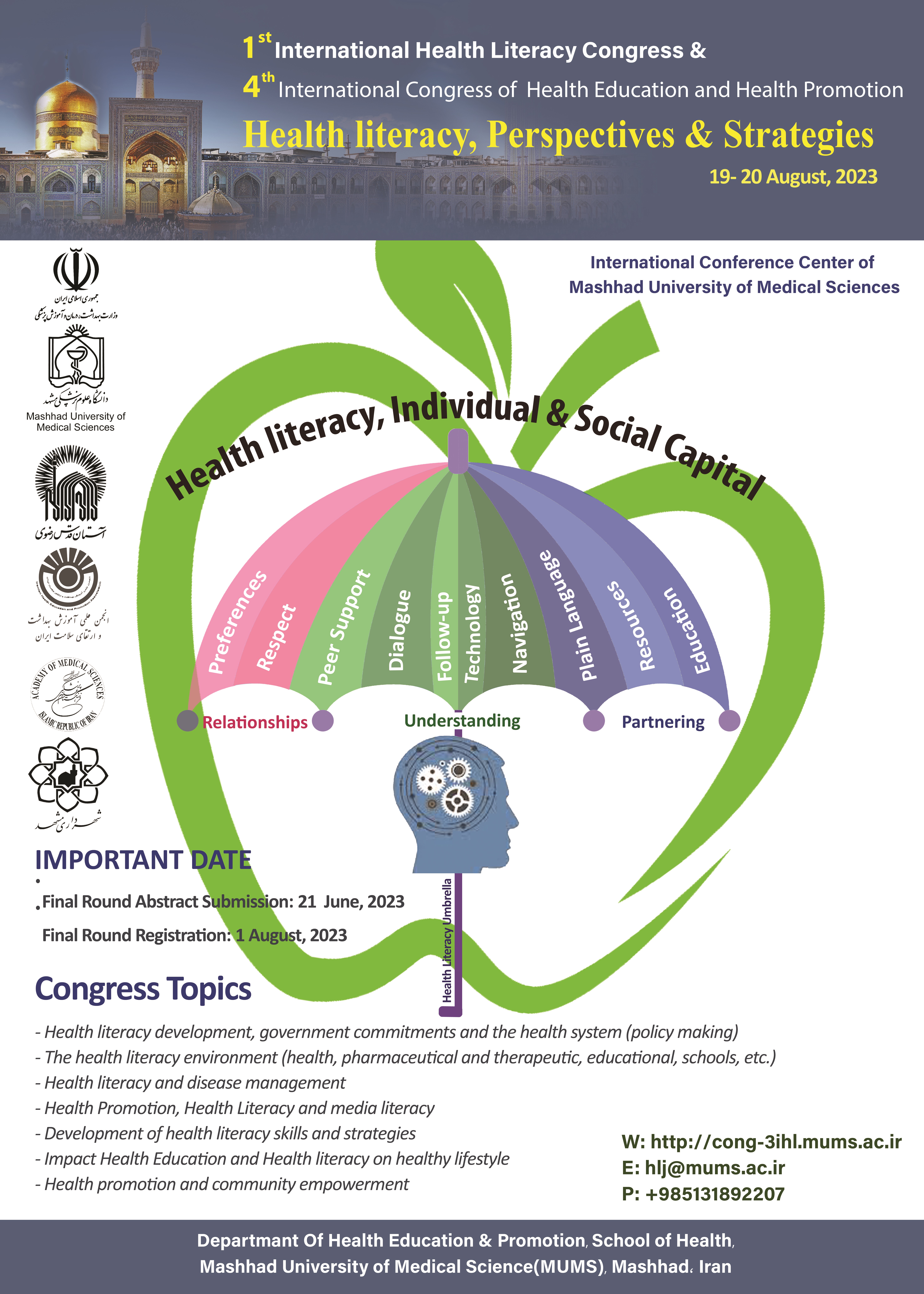 قابل توجه اعضای محترم هیأت علمی و دانشجویان گرامی به اطلاع می رساند مهلت ارسال چکیده مقالات به اولین گنکره بین المللی و سوم همایش ملی سواد سلامت تا پایان تیرماه سال جاری تمدید گردید. شایان ذکر است گنکره مذکور در تاریخ های 28 و 29 مردادماه سال جاری در مشهد مقدس برگزار می گردد. |