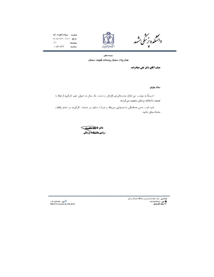 جناب آقای دکتر علی عمادزاده انتصاب شایسته جنابعالی را به عنوان عضو کارگروه دفتر ارتباط با صنعت دانشکده پزشکی تبریک عرض نموده و آرزوی موفقیت می نماییم. |