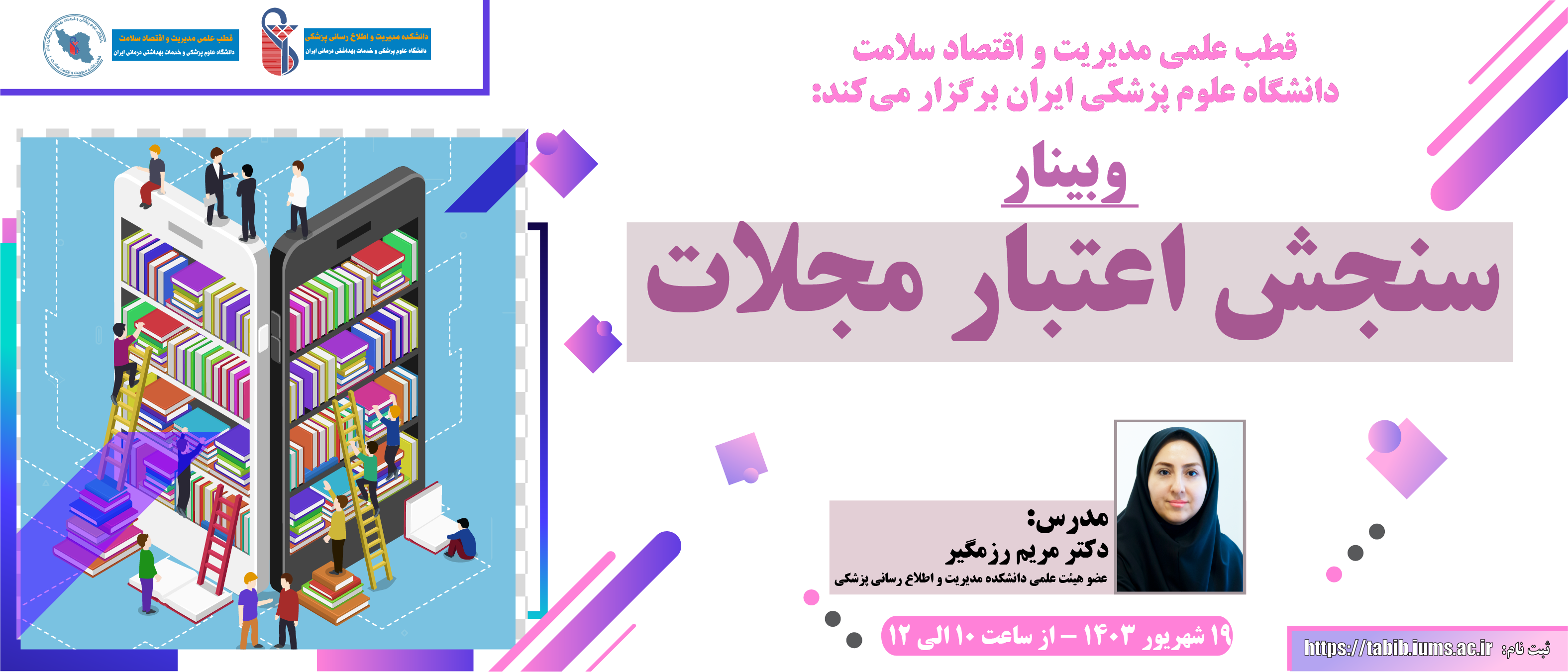 قطب علمی مدیریت و اقتصاد سلامت دانشگاه علوم پزشکی ایران در تاریخ 19 شهریورماه 1403 ساعت 10 الی 12 وبینار سنجش اعتبار مجلات را برگزار می کند. لینک ثبت نام: http://tabib.iums.ac.ir در صورت هرگونه سوال، با شماره 88794302-021 (داخلی 192) تماس بگیرد. |