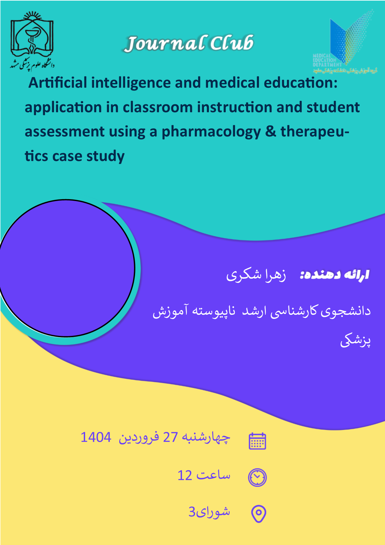عنوان مقاله: Artificial intelligence and medical education: application in classroom instruction and student assessment using a pharmacology & therapeutics case study استاد راهنما: خانم دکتر اعظم نوروزی دانشجو: دانشجویان ورودی 1401 مقطع کارشناسی ارشد رشته آموزش پزشکی زمان: چهارشنبه 1404/01/27 ساعت 12 مکان: سالن شورای 3 |