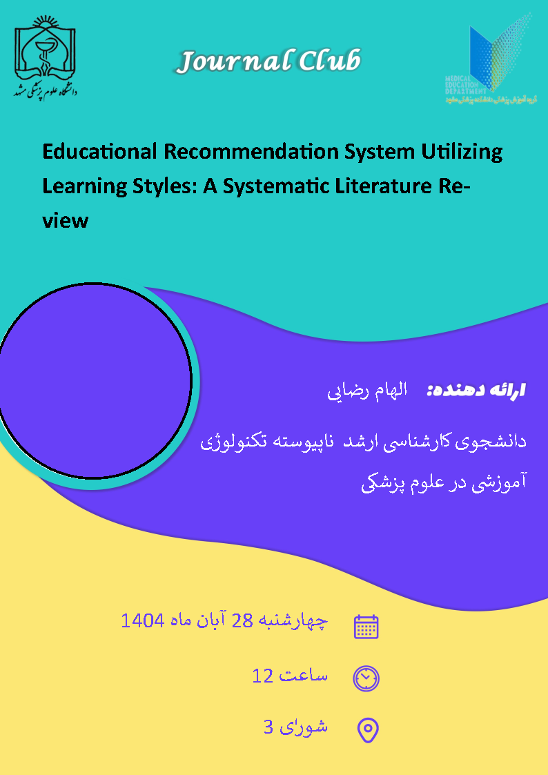 استاد راهنما: آقای دکتر علی عماد زاده دانشجو: دانشجوی مقطع کارشناسی ارشد رشته تکنولوژی آموزشی در علوم پزشکی زمان: چهارشنبه 1404/08/28 ساعت 12 مکان: سالن شورای 3